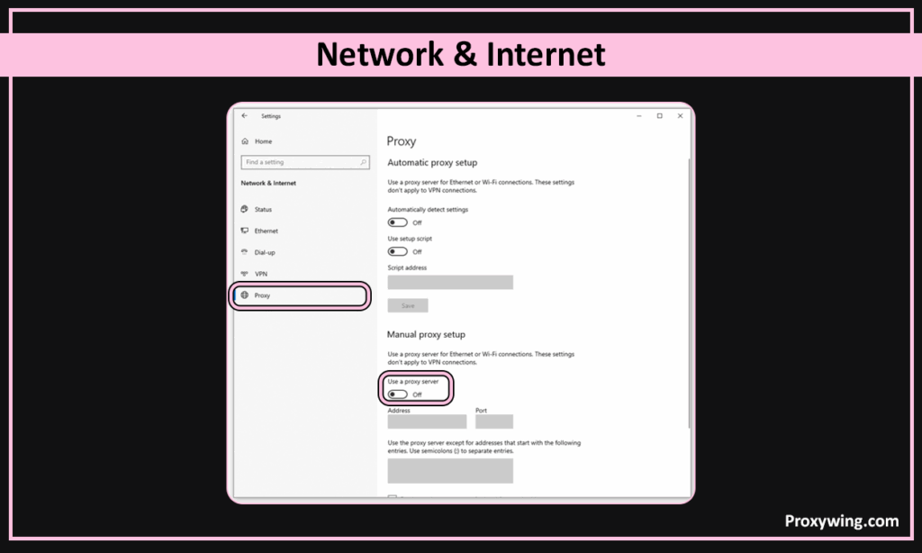 On the left side of the screen, select «Proxy». At the bottom, you will find the toggle «Use a proxy server»; turn it on.