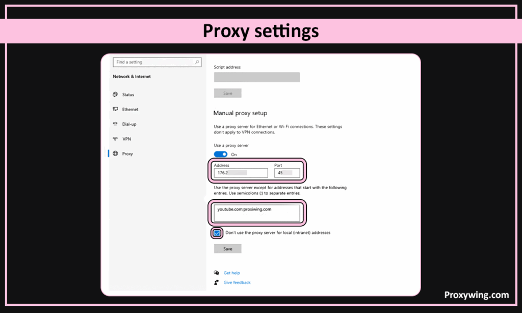 In the «Address» field, enter the IP address of the proxy server you want to use. In the «Port» field, enter the proxy server’s port. Below, you can specify addresses for which you do not want to use proxy servers. Also, check the box «Do not use a proxy server for local (intranet) addresses». This setting may affect working with local devices. Click «Save» at the bottom of the screen.