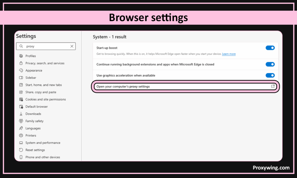 Edge is built on the Chromium engine and does not support configuring a proxy directly within the browser. However, if you set up a system-wide proxy, all outgoing requests from the browser will be routed through it. In the following sections, we’ll explain how to configure a proxy on Windows and macOS. If you only need to set up a proxy for your browser, you can use the ProxyWing Proxy Manager extension, available for Chrome and Firefox. You can learn more about its features and configuration in the detailed documentation.