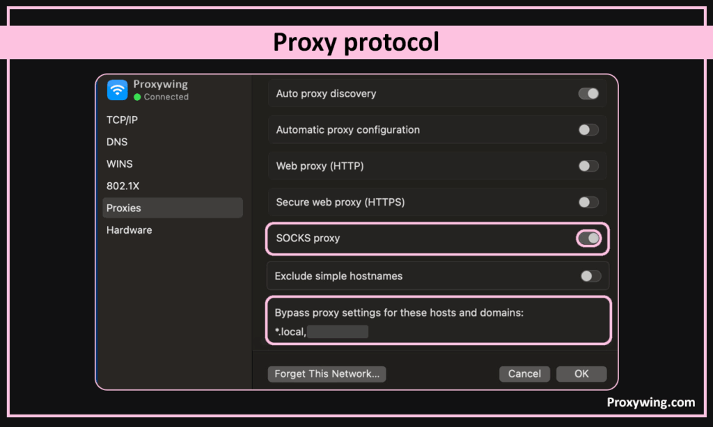 The macOS operating system supports many protocols. Choose the one you need and toggle it on. We will demonstrate proxy configuration based on the SOCKS protocol. Below, you can set exceptions — addresses for which proxies will not be used.
