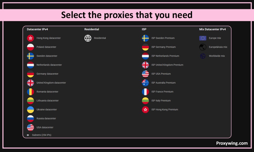 Residential traffic proxies: High-quality IP addresses from Internet service providers. In this category, proxies are provided using the pay-per-traffic model.