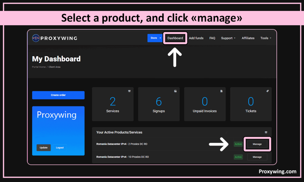 4. Open your dashboard, select a product, and click “manage”.