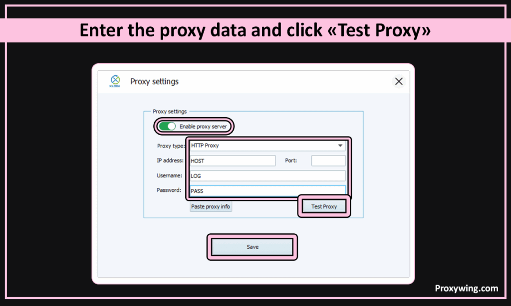 Proxywing’s proxies support SOCKS5 and HTTP connection. Enter the proxy data in the appropriate fields and click “Test Proxy”
