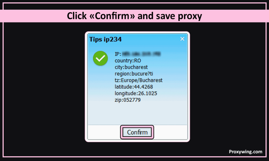 9. If you see a green check mark indicating the IP address, it means that the proxy is working. Click “Confirm” and save the proxy.