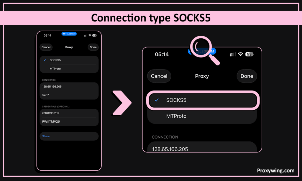5. Important: select SOCKS5 as the connection type (this is critical for bypassing blocks in Russia).