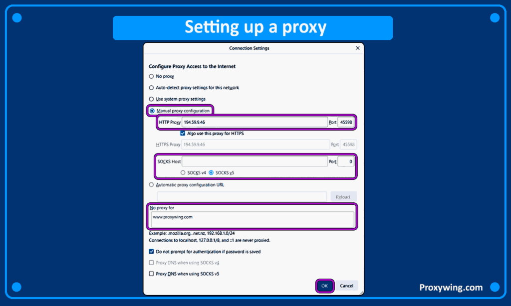 Select the «Manual proxy configuration» option, then enter your proxy details according to the protocol. Firefox supports HTTP, SOCKS, and HTTPS proxies. Enter the IP address and port of the proxy next to the corresponding protocol. If you do not want to use the proxy for certain websites, you can list them in the «No proxy for» section. Once you have finished configuring the proxy, click «ok».