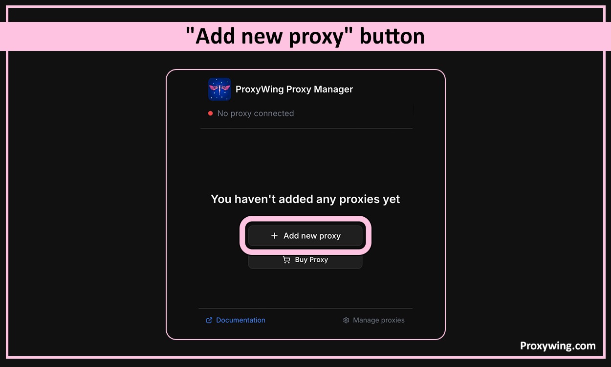 Once the extension installation is complete, click the ProxyWing icon in your toolbar to open the configuration panel. Click the “Add new proxy” button. This launches an interface that you can use to configure the extension, including inputting the proxy settings.