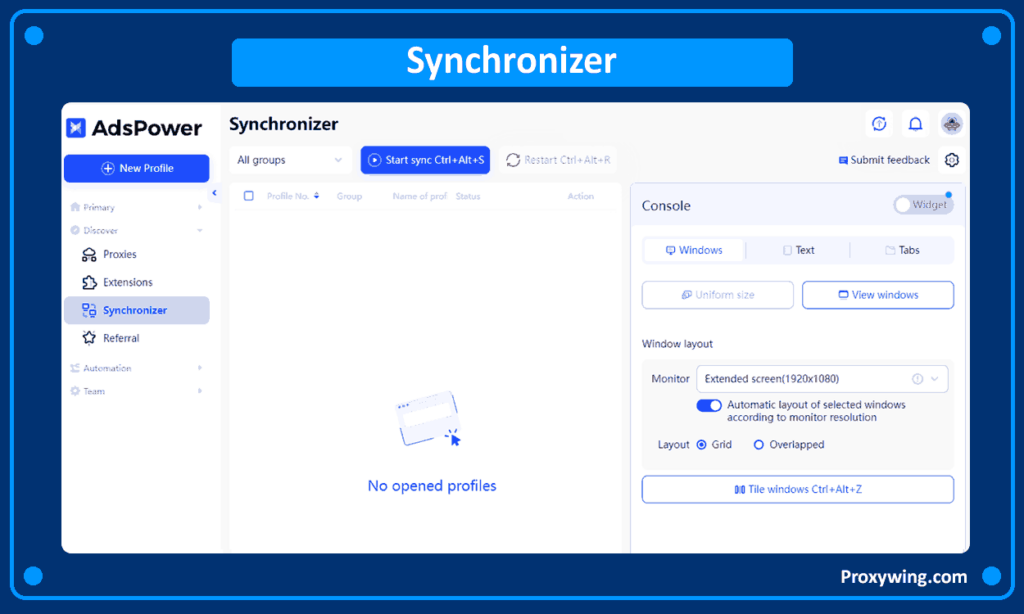 In this tab, you can perform the same actions on multiple profiles simultaneously. There are delays for clicks, typing, and other useful features. This allows for significant time savings. The synchronizer is available only for Sunbrowser.