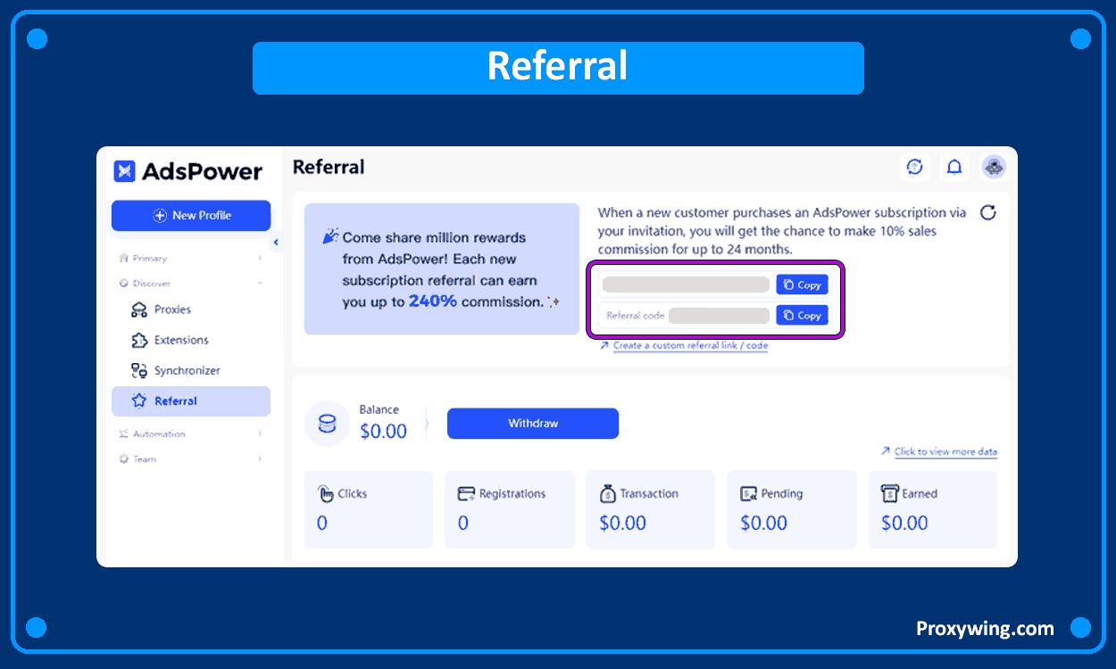 In this tab, you can find your statistics for invited users, as well as a referral link or code. New users who register using your invitation will allow you to earn a 10% commission on sales for up to 24 months.