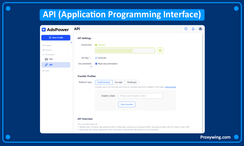 This section is used by developers for integrating AdsPower’s capabilities with other systems. The local API allows the implementation of all necessary functions, such as retrieving profile configuration data, launching and closing profiles, and querying profiles using basic APIs. It is compatible with Selenium and Puppeteer. Examples of code in JavaScript and Python can be found on GitHub.