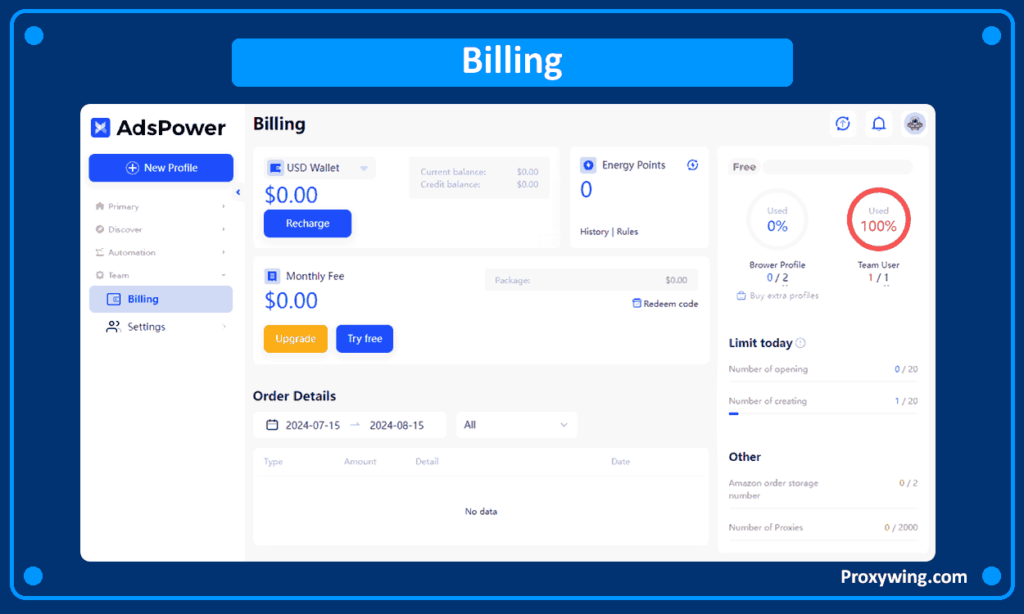 The low price of AdsPower is an advantage that immediately stands out. You can access the basic features of the anti-detect browser for $9 per month ($5.40 with an annual subscription). For this amount, you get 10+5 browser profiles. However, if you choose 100 profiles, the price jumps to $36, which is comparable to the market average.