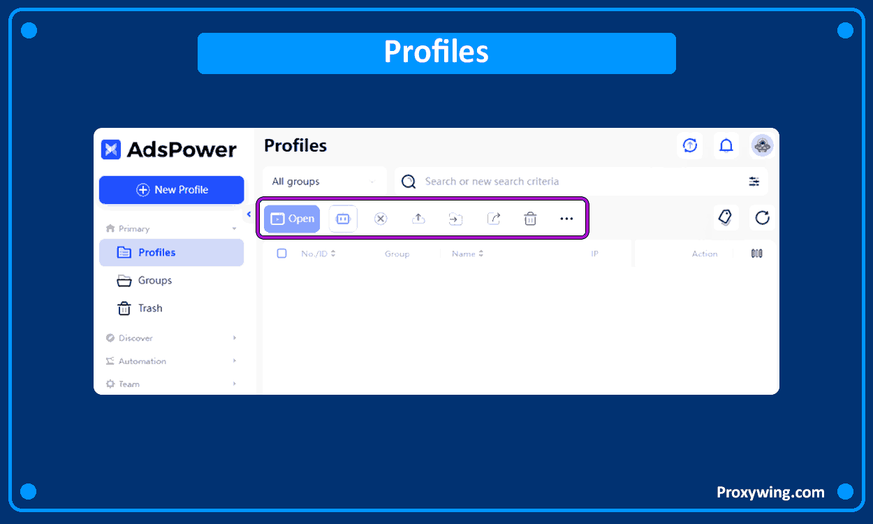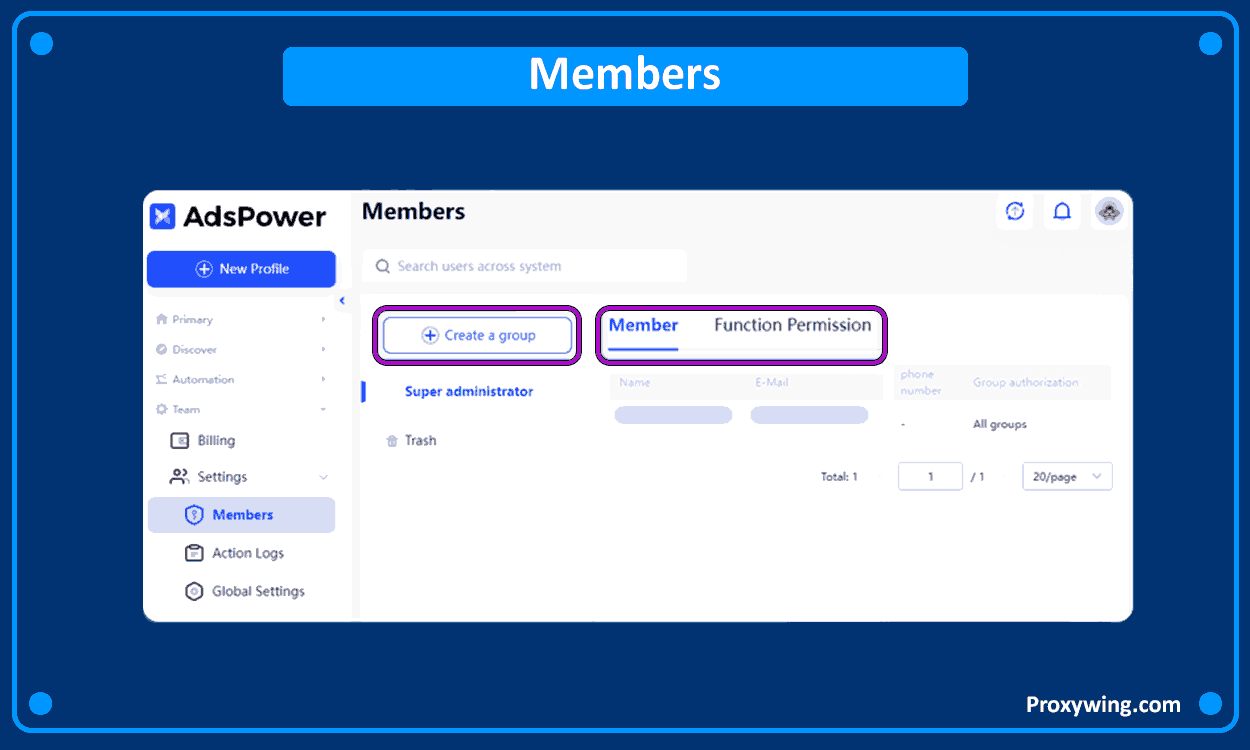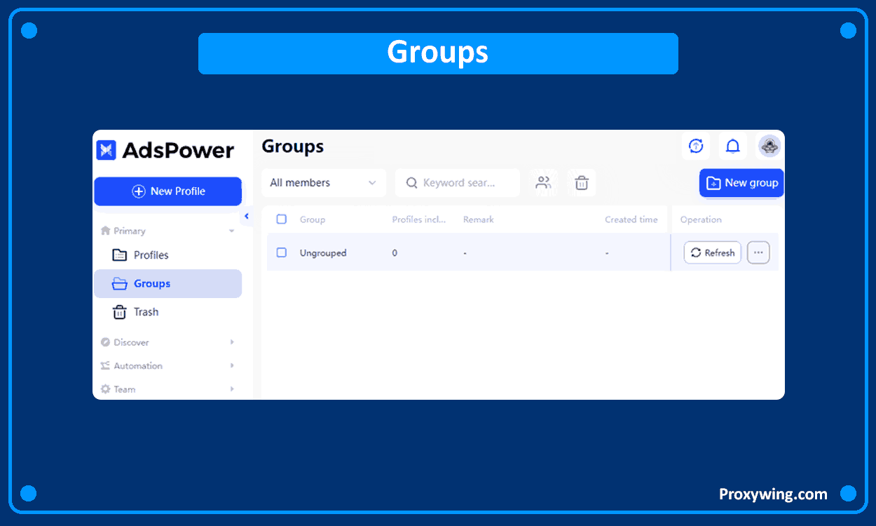 One of the main advantages of AdsPower is its flexible configuration, including the ability to sort profiles into groups with different permissions and the ability to assign employees to the necessary groups. In this tab, you will also find a search function by keywords, which allows for easy and effective team management.