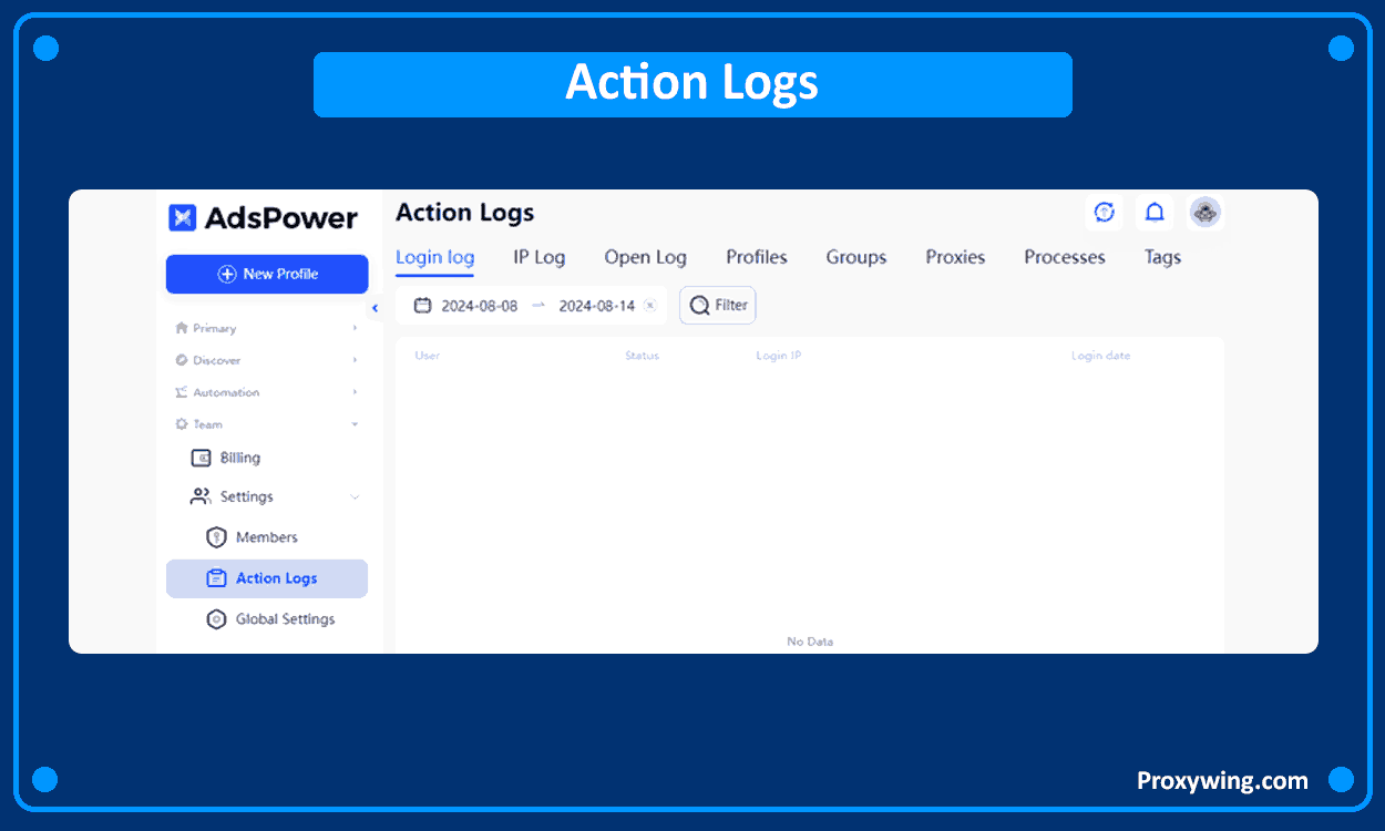 The action logs allows you to monitor the use of your profiles and the actions of your employees. It collects detailed statistics, including the IP addresses from which profiles were accessed.