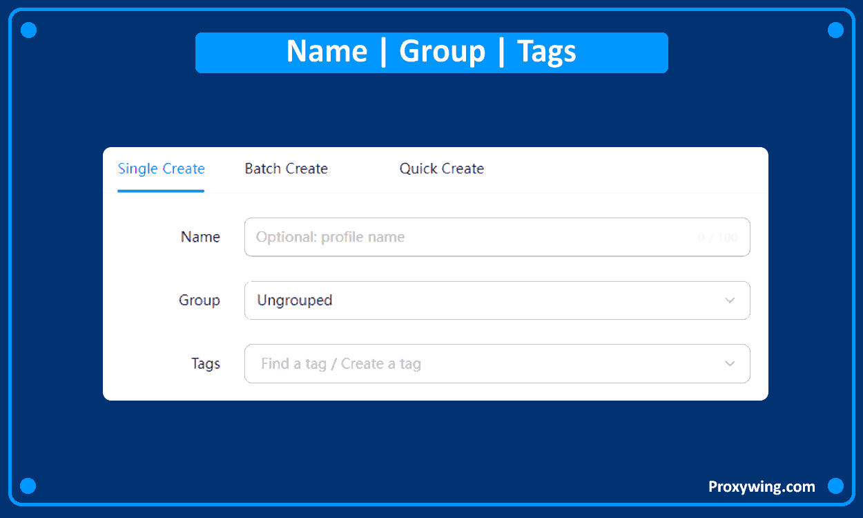 Next, you need to come up with a profile name. You can add this profile to a group, which can be created in the groups tab on the right, and add tags for ease of profile use. All these settings can be changed at any time.