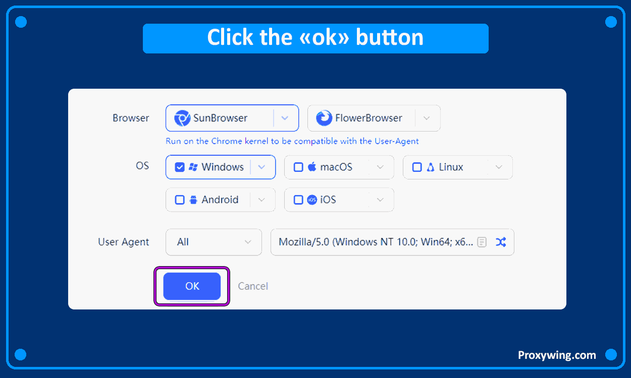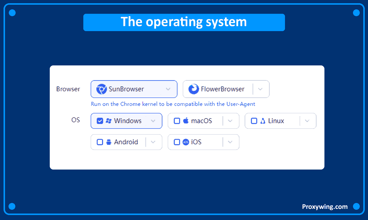 Choose a browser, currently available are SunBrowser, built on the Chrome core, or FlowerBrowser, built on the Firefox core. Our editorial team recommends using SunBrowser, as it offers more functionality. Choose the operating system that suits you. AdsPower developers advise using the same operating system as on your device to increase anonymity and reduce the risk of errors due to data entry.