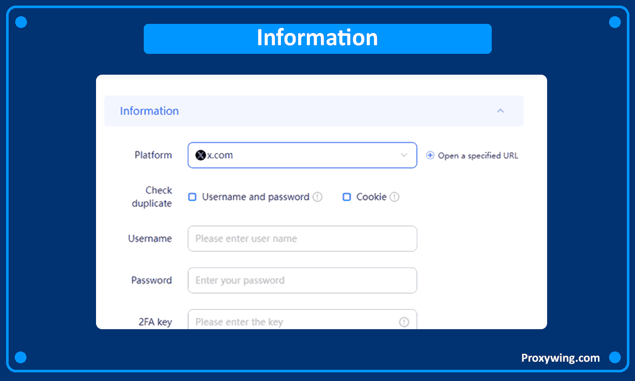 The “Information” section allows for automatic logins to various accounts, including the login and password, as well as the 2FA key if it is used. Select the necessary platform and enter the authentication details.