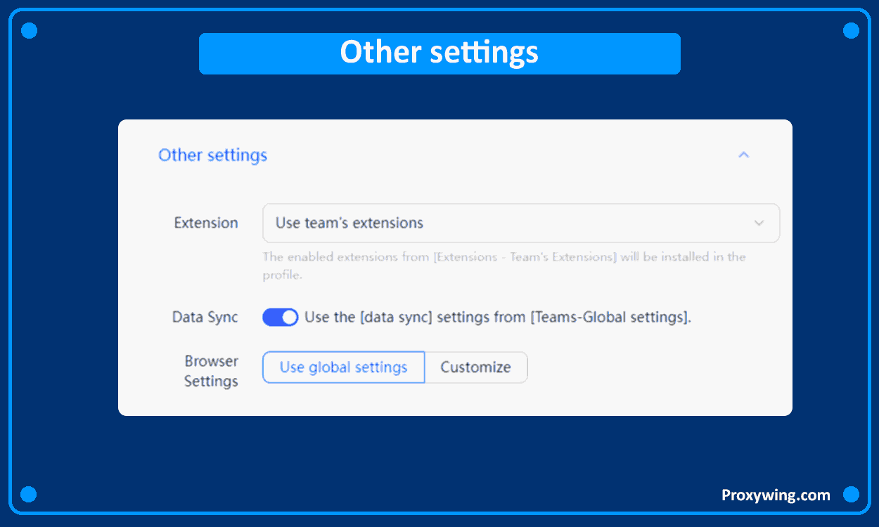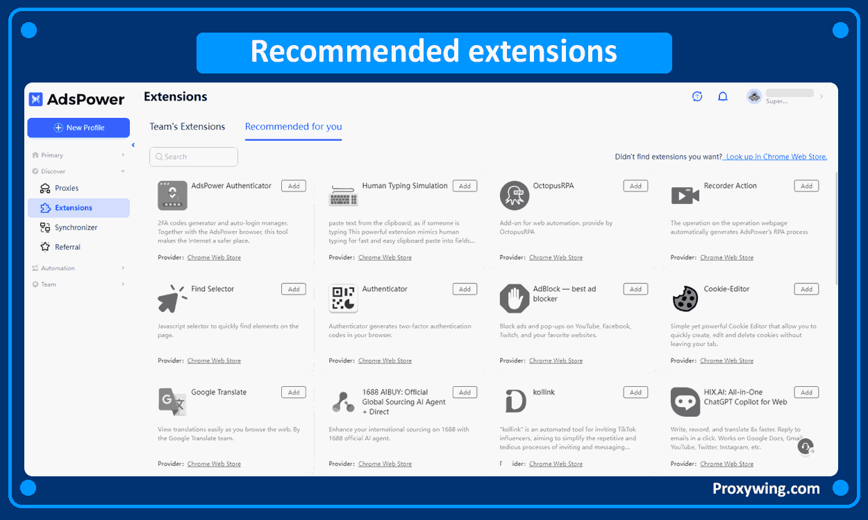 This tab allows you to add extensions from the Chrome Web Store. Added extensions will appear on every profile. In the paid version, it enables synchronization of extensions for all team members. It works only with Sunbrowser.