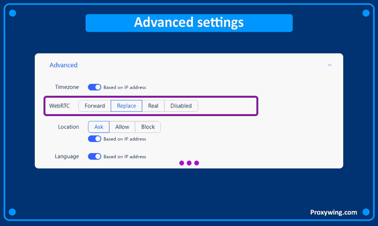 The “advanced” section is the most comprehensive. Our editorial team advises paying close attention to the “WebRTC” setting, a protocol that transmits audio and video streams in real-time. By default, this mode is turned off, but our team recommends enabling the “replace” mode. This setting is usually enabled for ordinary users, and disabling WebRTC may be considered suspicious.