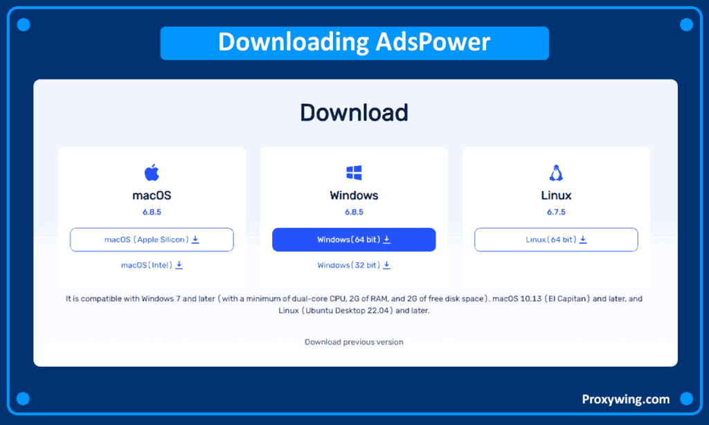 Additionally, there is a brief description of the update release and a tab for “Download previous version.” This can be useful for obtaining a previous, more stable version of the anti-detect software.