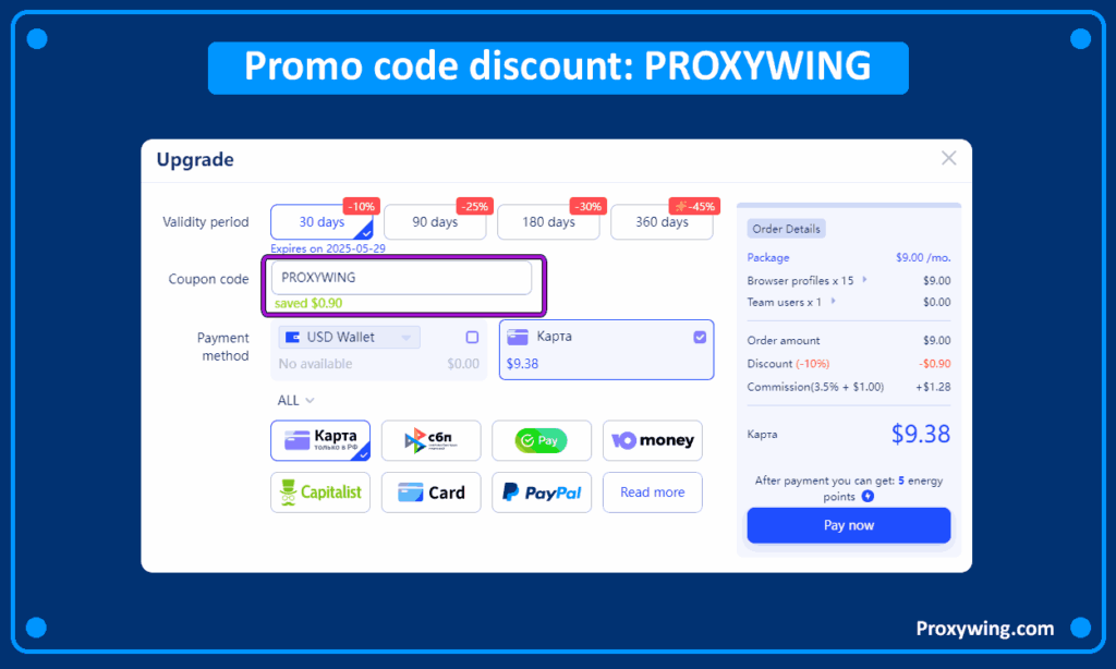 AdsPower supports a variety of payment methods, including cryptocurrency.
