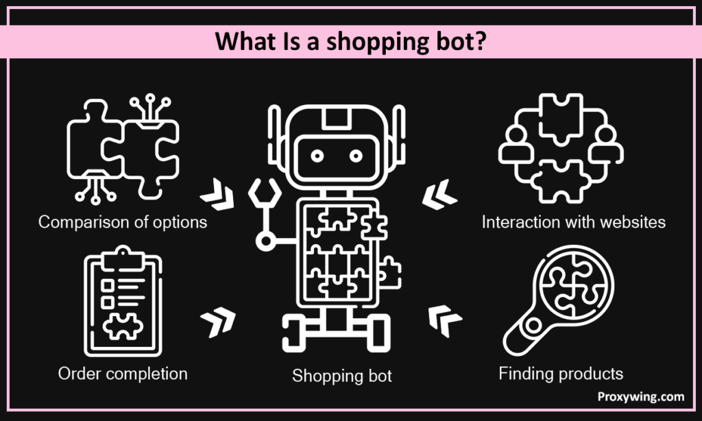 A shopping bot is an automated software tool that helps users shop products on online stores without having to do everything manually. A bot interacts with websites or apps to find products, compare options, and sometimes complete orders on behalf of the online shoppers.