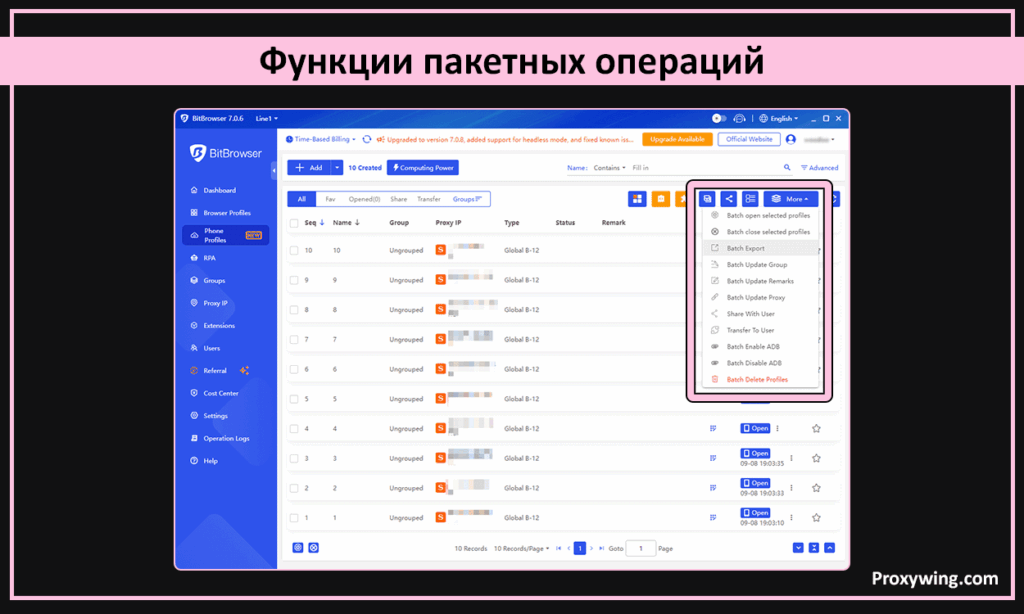 - Пакетная настройка прокси: массовое назначение прокси-серверов и параметров отпечатков браузера для группы профилей одновременно.