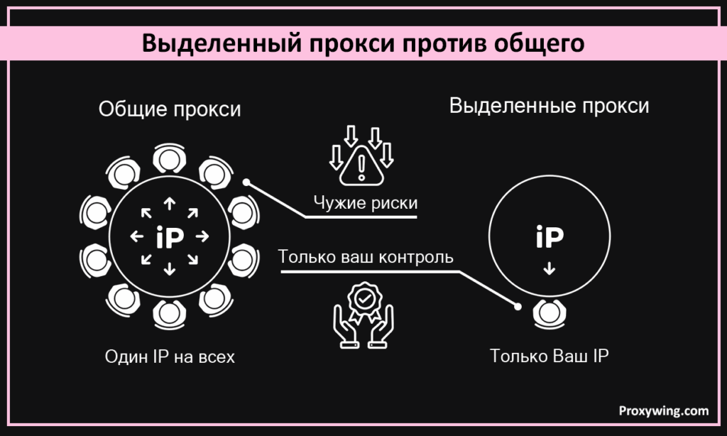 - Выделенные прокси: они исключают подобные риски. Каждый получает свой канал. Это гарантирует производительность. Блокировки случаются крайне редко.