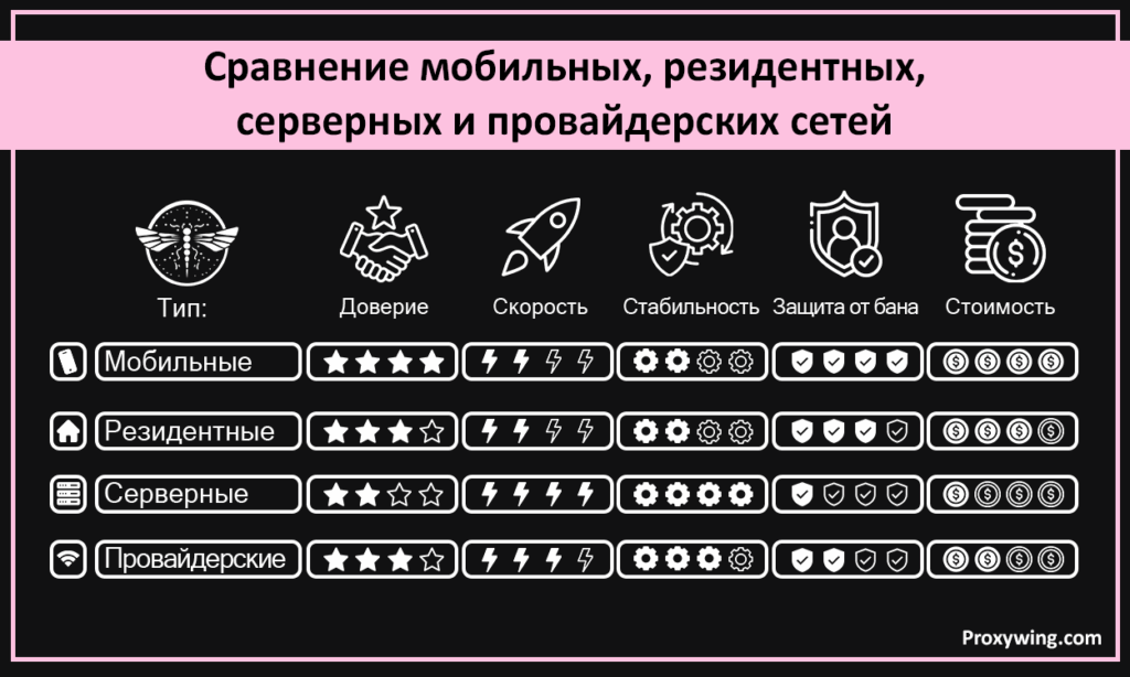 Сравнение мобильных, резидентных, серверных и провайдерских сетей