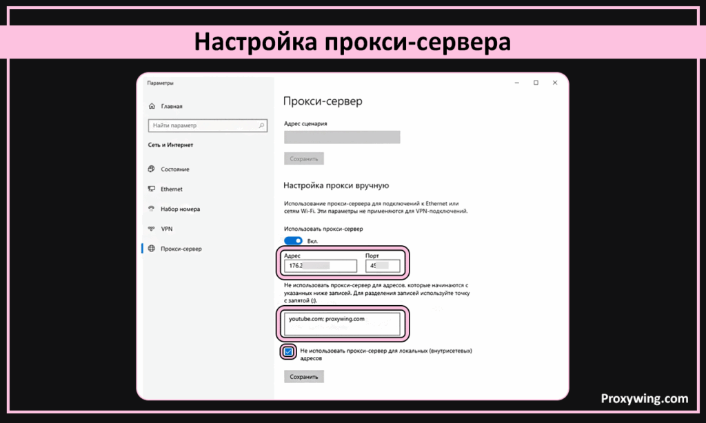 Перейдите в меню. На рабочем столе Windows выберите Параметры – Сеть и интернет – Прокси-сервер. Это откроет доступ к параметрам выбранной сети.