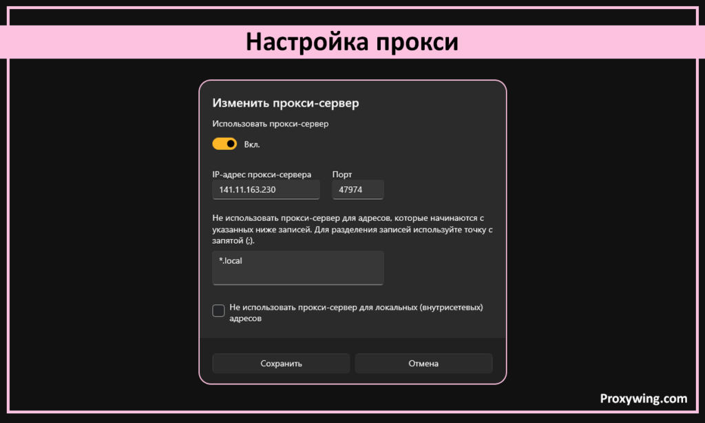 Прокрутите до раздела «Ручная настройка прокси-сервера». Переведите переключатель «Использовать прокси-сервер» в положение «Вкл.». Введите сетевой адрес прокси и порт, полученные от ProxyWing.