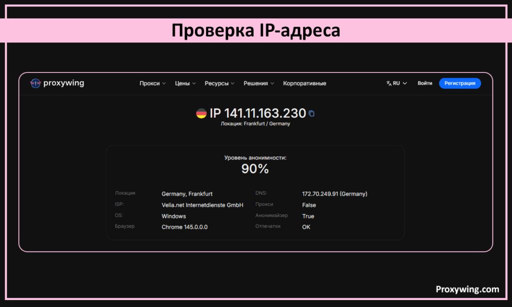 Прежде чем приступить к работе в TikTok, зайдите на IP-чекер Proxywing и убедитесь, что браузер показывает сетевой адрес прокси, а не ваш реальный.