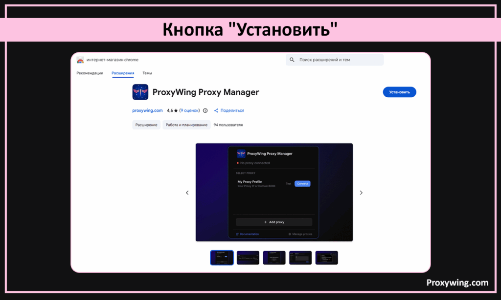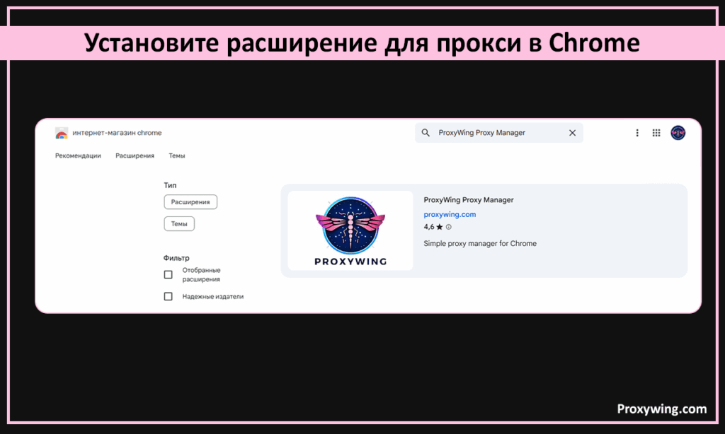 Откройте Chrome Web Store и найдите проверенный менеджер прокси – ProxyWing Proxy Manager.