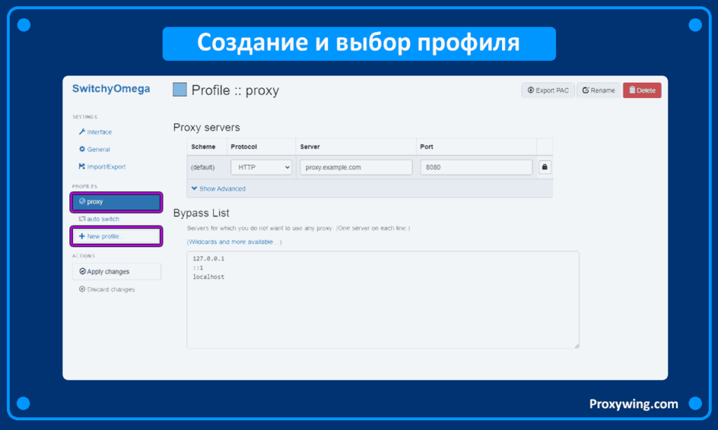В левой части вы можете создать профиль или выбрать уже готовый для настроек прокси.