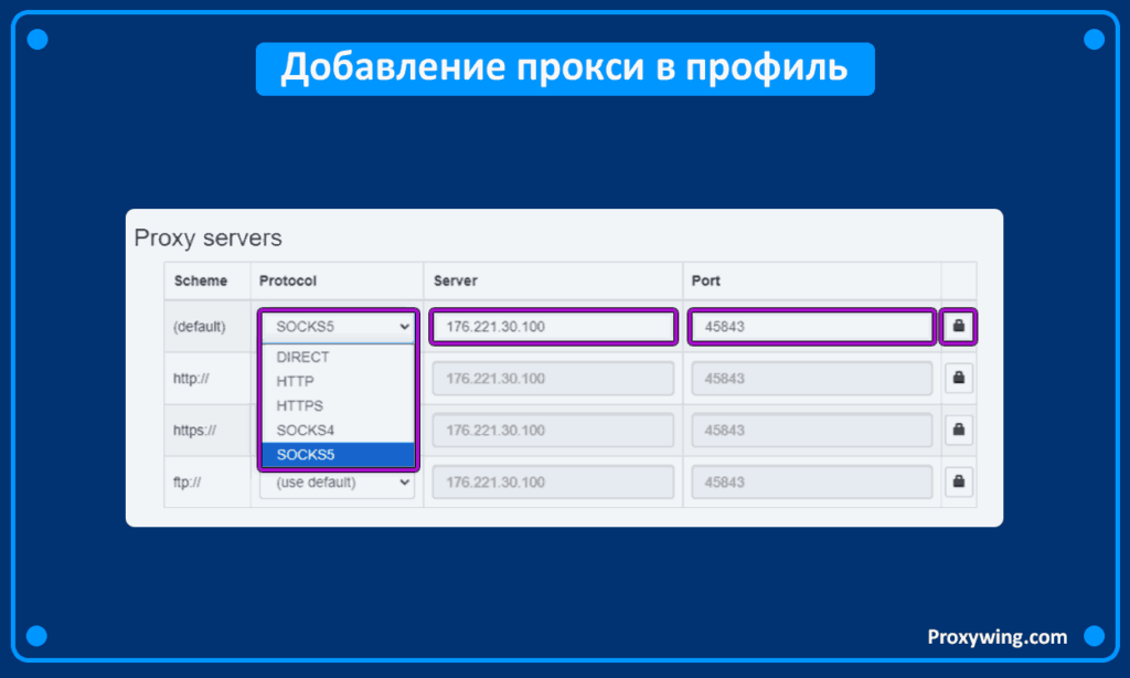 Далее выберете нужный профиль и введите данные от прокси. В столбце «Protocol» можно выбрать протокол, который будет использоваться при выборе этого профиля. «Direct» – прямое подключение, без прокси. В поле «Server», впишите IP-адрес прокси, а рядом порт прокси.