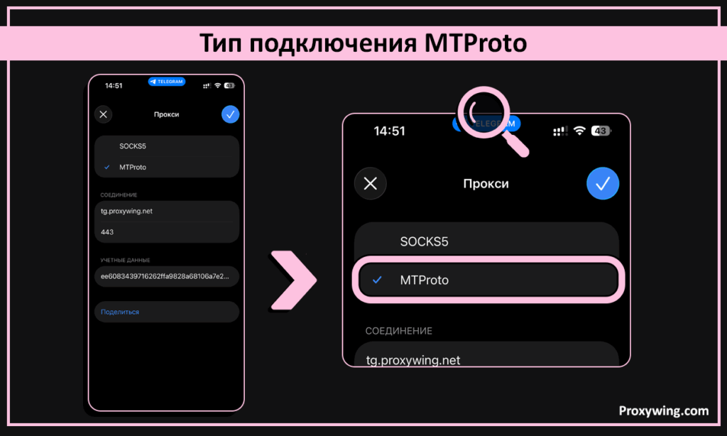 5. Важно: выберите тип подключения MTProto (это критически важно для обхода блокировок в РФ).