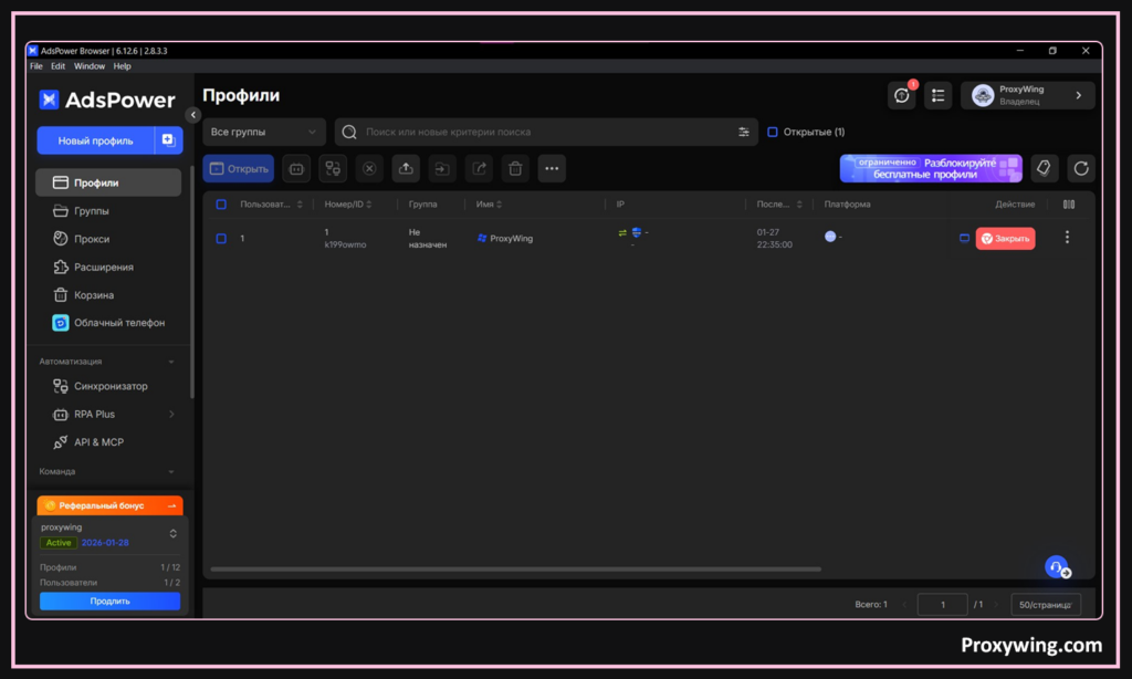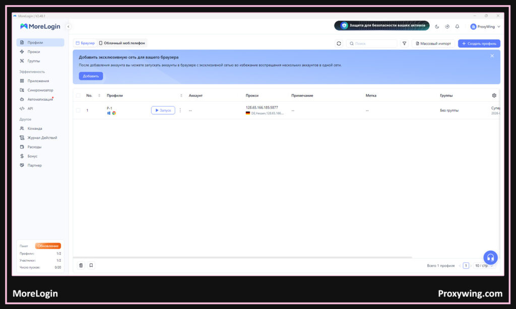 - Масштабное управление профилями: пользователи могут создавать и управлять 300+ профилями одновременно.